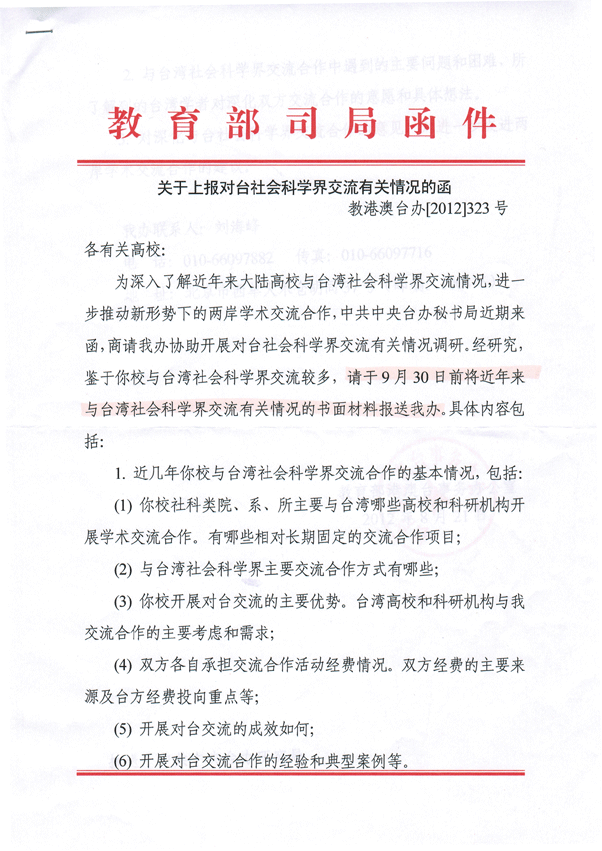 教育部对我校社科类学术交流活动有关情况进行调研,港澳台事务办公室要求我院上报近年来与台湾地区合作情况。