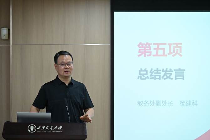 典礼最后,教务处副处长杨建科对本次暑期学校进行总结。他很欣慰看到同学们的成长与收获,并强调,“西迁精神”不仅是西安交通大学宝贵的精神遗产和办学特色,也是激励广大青年学子不断前进、勇攀高峰的强大精神动力源泉。经过在交通大学的学习生活,同学们都深刻领悟到西迁精神的内涵,我们都是西迁精神的新传人。他指出,西安为暑期学校的举办提供了天然沃土,希望大家能够对西安这座千年古都源远流长的文化、历史和精神有所体会,坚定文化自信,坚守中华文化立场,讲好中华文明故事。