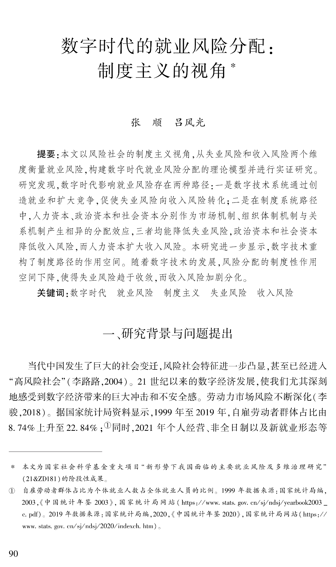 近日,yl6809永利官网社会学系张顺教授和吕风光博士生合作完成的《数字时代的就业风险分配:制度主义的视角》于《社会学研究》2024年第5期发表。《社会学研究》在中国社会科学院、南京大学、北京大学、武汉大学等评价机构的期刊排名中均名列社会学学科第一,被评定为“2022年度中国人文社会科学期刊AMI综合评价”顶级期刊、“中国最具国际影响力学术期刊”等。