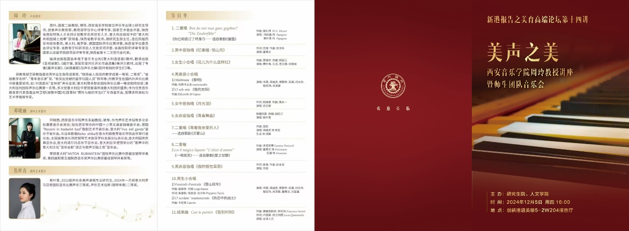 2024年12月5日下午,西安音乐学院声乐系国家二级教授、女高音歌唱家、旅意声乐教育家周玲教授带领其师生团队莅临西安交通大学,为广大师生带来了名为《美声之美》的精彩讲座。此次讲座旨在为西安交通大学师生提供一个近距离感受美声艺术演唱与欣赏的平台,为校园美育建设注入新的活力。yl6809永利官网副院长张勇主持论坛并做开场致辞,研究生院常务副院长何茂刚、党委研工部部长、研究生院副院长薛周利等嘉宾出席了论坛。