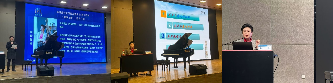 在论坛中,周玲围绕美声艺术进行了深入讲解,还特别安排了互动环节,让现场同学上台参与。周玲教授讲到,声乐是一门实践学科,在艺术学门类下音乐领域的声乐专业有其独特性,因为它的乐器就是人体本身,目前中国的演唱领域基本分为四种唱法,即美声唱法、民族唱法、通俗唱法和原生态唱法。美声是其中不可或缺的重要部分。美声唱法不仅仅是一种演唱技巧,一种声乐流派,更是意大利歌剧诞生与发展的产物,经过不断探索发展成为一种极具表现力的音乐表现形式。讲座中,她详细介绍了声乐和美声唱法、美声与意大利歌剧的关系、意大利歌剧的起源与发展、美声表演与意大利语的联系以及美声歌唱之特点。在讲解过程中,周玲邀请现场学生上台,从发声部位、发声方式等方面对其进行了指导,并现场指导我校学生和声乐专业同学同台演示多声部旋律演唱,使我校师生对美声的演唱有了更真切的领悟。现场互动不仅让学生们有机会近距离感受美声艺术的魅力,也极大地提高了同学们的体验感和学习兴趣。