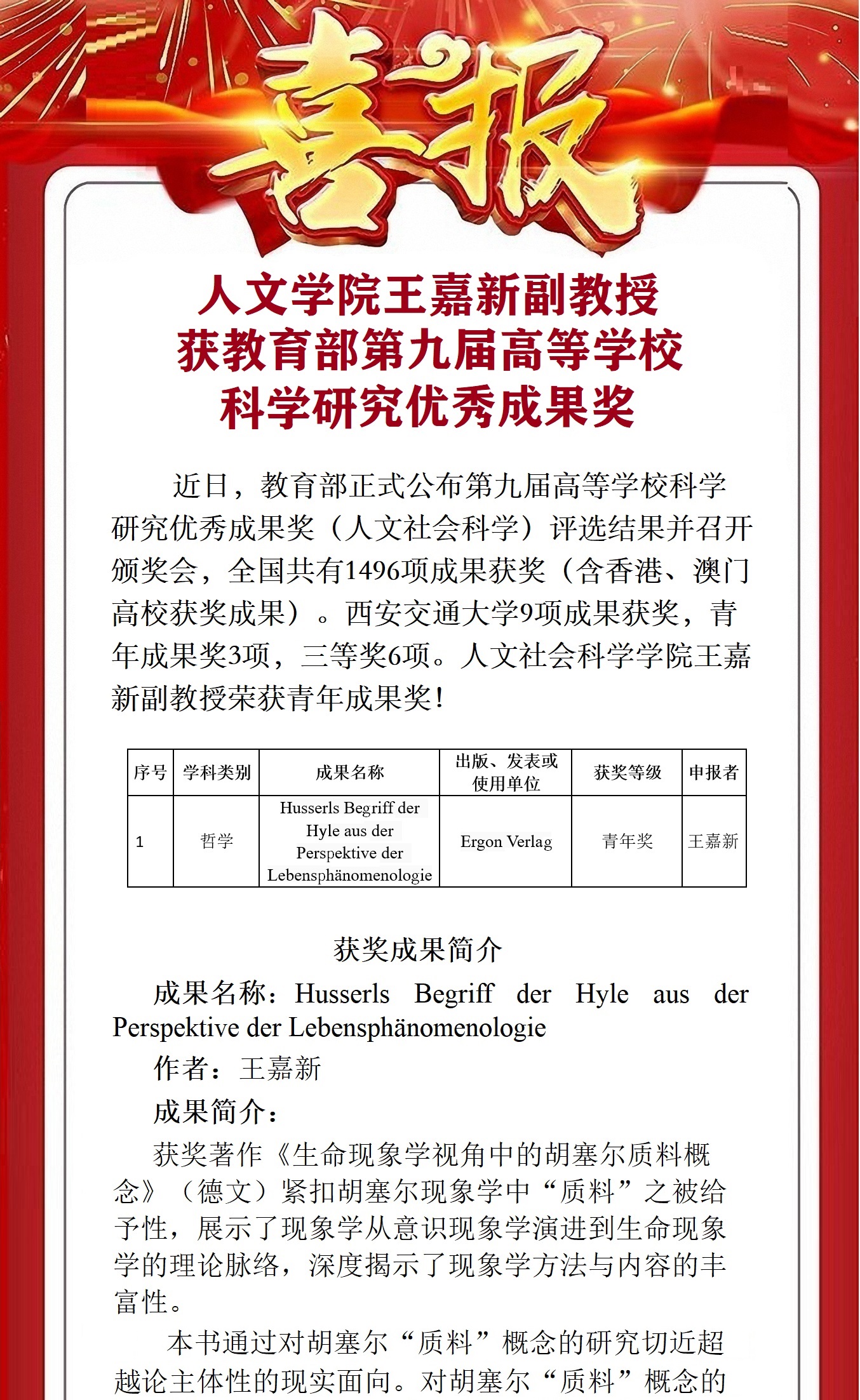 【喜报】yl6809永利官网王嘉新副教授获教育部第九届高等学校科学研究优秀成果奖