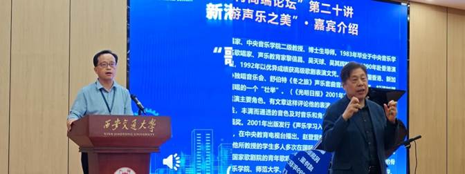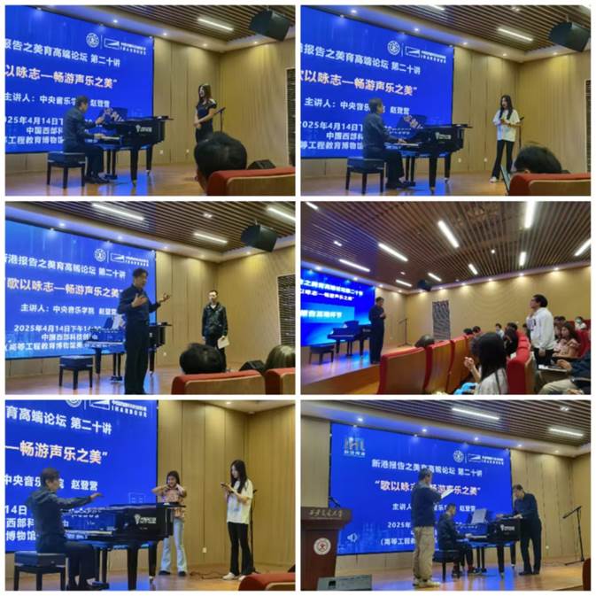 为营造高校美育氛围,提升学生审美感受力和鉴赏力,开发高校美育第二课堂,2025年4月14日下午,由西安交通大学研究生院、档案馆、博物馆、yl6809永利官网主办的新港报告之美育高端论坛第二十讲在创新港高等工程教育博物馆美育多功能报告厅火热开讲。著名低男中音歌唱家,声乐教育家,中央音乐学院二级教授赵登营先生为交大学子带来题为“歌以咏志——畅游声乐之美”的美育论坛,吸引了近200名校内外师生现场聆听。校党委常委、副书记王欢,档案馆、博物馆馆长吕青,后勤保障部副部长巩滨,研究生院副院长龙建纲,校团委副书记毕晓楠,yl6809永利官网副院长张勇受邀作为嘉宾参与本次论坛。