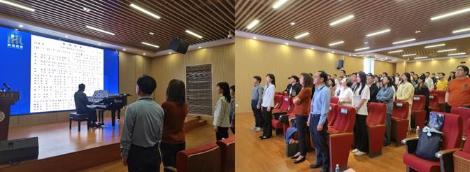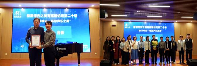 此次报告收获了广大师生与校外听众的热烈反响。在互动提问环节,来自校合唱团的同学和听众就假声与换音、内听觉与外听觉、换声点喉位如何稳定等话题与赵老师展开了互动交流。论坛最后,所有在场师生高唱《歌唱祖国》,张勇副院长向赵老师颁发荣誉证书,学生代表向赵老师献花,并与赵老师一同合影留念。