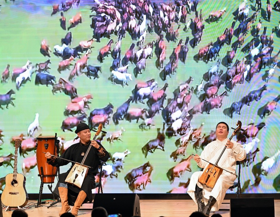 音乐教育中心的教师团队与两位演奏家合奏的《赞歌》《蒙古人》《天边》《乌兰巴托的夜》《鸿雁》等经典曲目,通过马头琴、大提琴、萨克斯、钢琴、键盘、吉他、鼓等不同乐器的巧妙组合,将观众带到了辽阔神奇的草原,时而悠扬舒缓、流畅深情,时而豪迈豁达、自由奔放,既展现了浓郁的民族风情和蒙古族人民的豪放热情,又展现了风格各异的乐器所独有的特色。