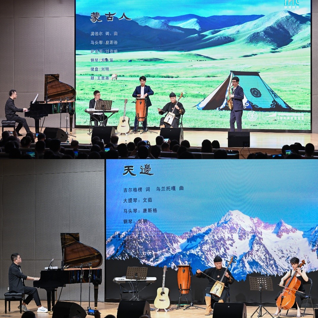 正值西安交通大学129周年校庆之际,我校中华民族共同体学交叉学科博士点获批,为进一步推动中华民族共同体基地建设,使更多师生感受中华文化和民族艺术的魅力、加强我校美育活动的普及与传播,强化文化浸润、艺术涵养、实践创新协同的全方位育人体系,将科学精神与人文情怀有机融合,4 月 27 日、29 日分别在兴庆校区丝路大讲堂和创新港新港报告厅举办了“琴韵草原之声音乐会——西安交大专场”。西安交通大学音乐教育中心教师团队携手国际知名马头琴演奏家朝鲁门、唐斯格,以蒙古族乐器马头琴为核心,融合中西方多种乐器,通过 11 首经典曲目及特色互动环节,为我校师生带来一场跨越时空的视听盛宴。