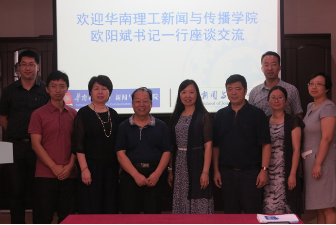 7月6日上午,华南理工大学新闻与传播学院欧阳斌书记一行四人到访我校新闻与新媒体学院,并与我校新闻与新媒体学院师生进行了座谈交流。参与座谈交流会的有华南理工大学新闻与传播学院欧阳斌书记、段淳林副院长、朱剑飞副院长和张庆园老师,我校新闻与新媒体学院院长李明德教授、黄蓉副教授、张宏邦老师、张立老师以及部分博士研究生。