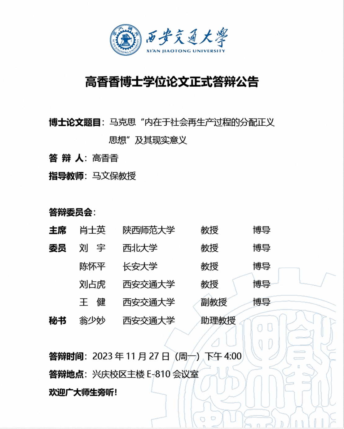 高香香博士学位论文正式答辩公告