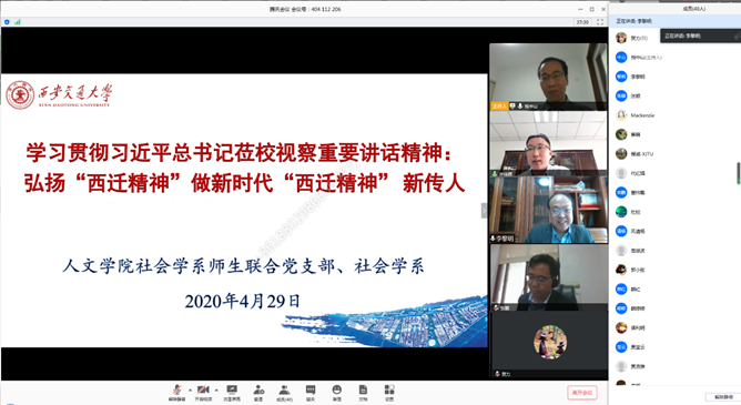 社会学系师生联合党支部书记悦中山副教授首先带领全体师生学习了习总书记莅校视察重要讲话精神,回顾了西迁精神的渊源、核心、精髓、重要价值等内容。悦老师向全系师生转达了学科带头人边燕杰教授在学习了总书记讲话精神后的表态:“把握好这个重要契机,全系/所师生一道,将交大社会学办的更好”。