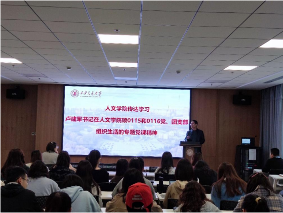 硕0115和0116党支部书记倪蒙同学传达了卢建军讲授的专题党课精神。他以卢书记在党课上提出的几个问题为线索,站在一名学生的角度理解卢书记对莘莘学子提出的要求。一是要学深悟透习近平新时代中国特色社会主义思想,以马克思主义哲学理解世界、指导实践;二是要知世情、知国情、知省情、知校情,理解和把握历史使命与挑战,提高自身站位,不局限于个人私利;三是要提升专业水平,结合专业特性,融入社会、服务社会,为社会发展贡献力量;四是要生发内心的使命感和责任感,将自我发展与国家、民族、未来的责任紧密联系,涵养积极作为的格局与气魄。他认为,卢书记提出的殷切期盼并不仅仅是对支部同志所提,更是对人文学子、交大学子所提。每一名交大学子都应该重责在肩,做一些伟大的事情不负这个伟大时代赋予的伟大使命。