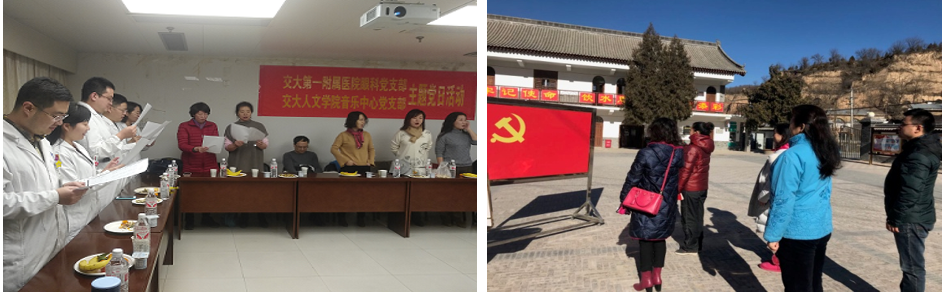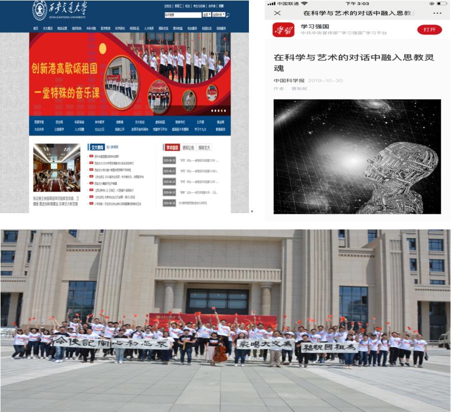 在课程思政方面支部引导教师积极探索。中心开设的《音乐鉴赏》《交响音乐赏析》课程被选为西安交通大学的第一批和第二批课程思政示范课程。《音乐鉴赏》课程在陕西省学习强国平台播出,中心党员教师撰写的文章被宣传部学习强国全文转载。支部从2017年开始与马克思主义学院联合,在思政课中融入音乐的内容,合作讲授了以“音符里的思想盛宴”“音乐中的理想信念”等为主题的交叉学科课程,取得了非常好的效果。《艺术欣赏与创作(音乐)》课程中,结合建国70周年,以“不忘初心,牢记使命”为主题,举办汇报音乐会和“快闪”活动,“活动受到100多家媒体关注,北京新华网、人民日报、中国文明网等首页新闻报道。《交响音乐赏析》课程作为课程思政的优秀案例被我校上报教育部。
