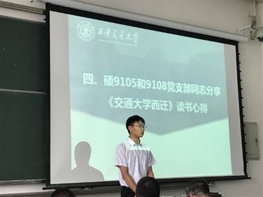 硕9105和9108党支部的王楠锋、李青龙、唐再煜同志汇报了各自对《交通大学西迁:使命、抉择与挑战》一书的学习心得。王楠锋同志首先介绍了此书的主旨内容、结构框架、作者概况及成书背景,以“大树西迁”“稻禾北渡”为主题重温了交大西迁这一伟大壮举。李青龙同志发表了题为《“党让我们去哪里,我们背上行囊就去哪里”》的读后感,他表示,中国西部科技创新港是交大主动探索21世纪现代大学与社会发展相融合的新模式、新形态和新经验,这是交大在新世纪的第二次西迁。唐再煜同志谈到作为西迁精神的新传人,我们始终要把实现民族复兴的要求与学校命运、个人发展紧密结合在一起,切实肩负起党和人民赋予的历史使命。