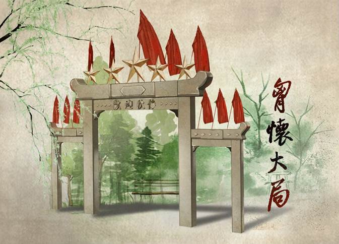 这是1956年交大西迁到西安的第一座校门,整体采用复古质朴风格,运用水彩表现,加以石墙材质,体现年代感和历史感。“胸怀大局”是西迁精神内涵的第一句,担当精神是我们新一代交大学子响应党的号召为建设祖国西部而无私奉献的壮丽凯歌。